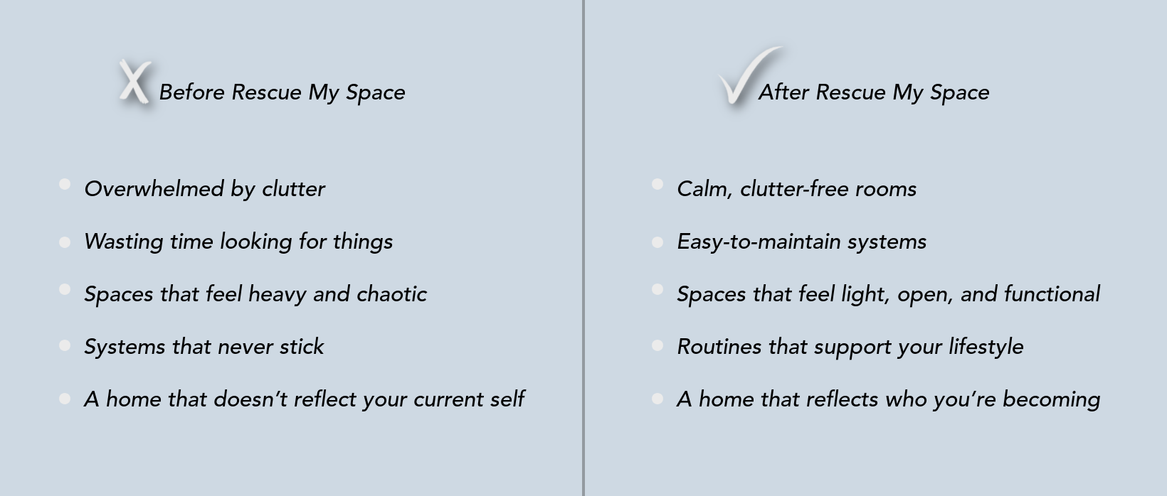 At Rescue My Space, we don’t just organize. We guide you through a proven three-step process that not only transforms your home but also your life.