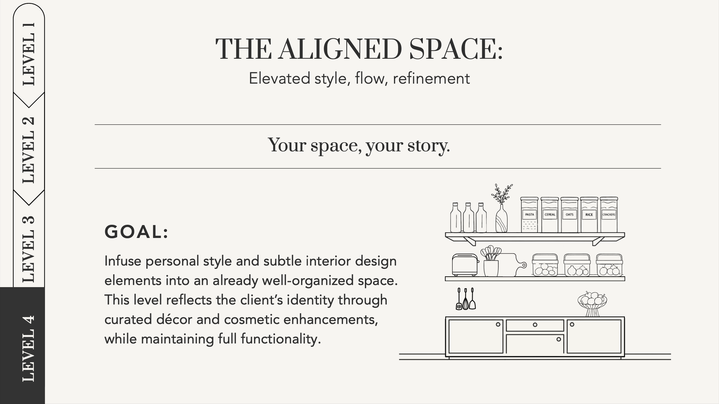 At Rescue My Space, every project moves through four intentional levels of organization, from simple function to fully aligned, styled spaces. These levels help you choose the experience that best fits your lifestyle, budget, and goals.