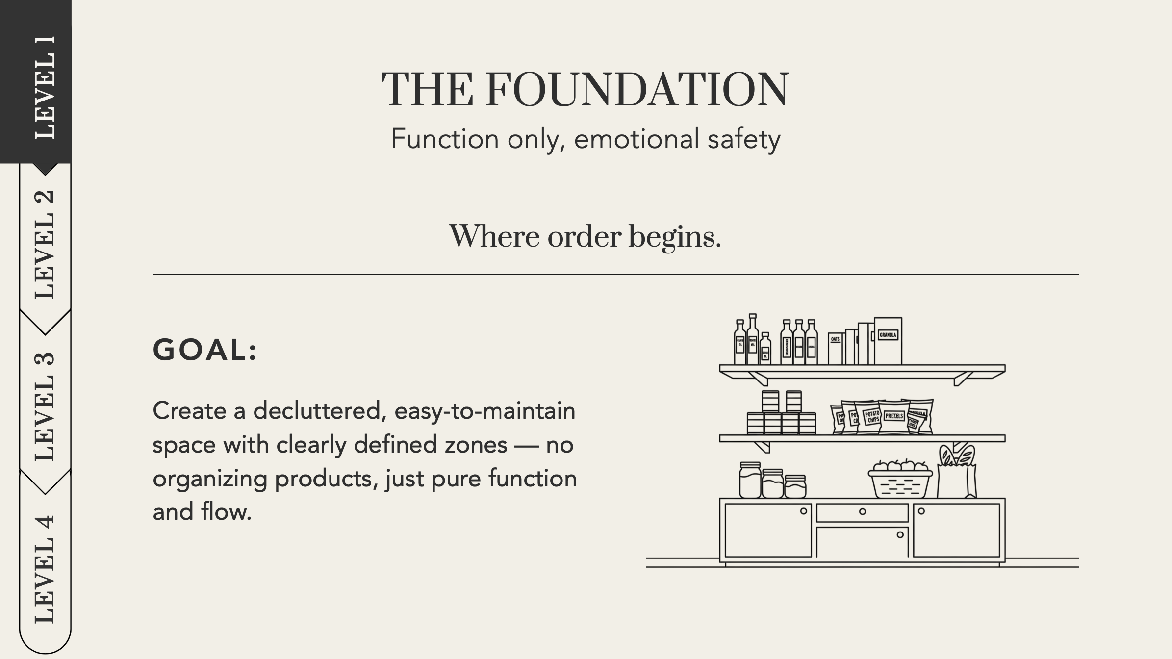Level 1 focuses on decluttering and creating clear, easy-to-maintain zones, so your home feels lighter and more manageable on a day-to-day basis.