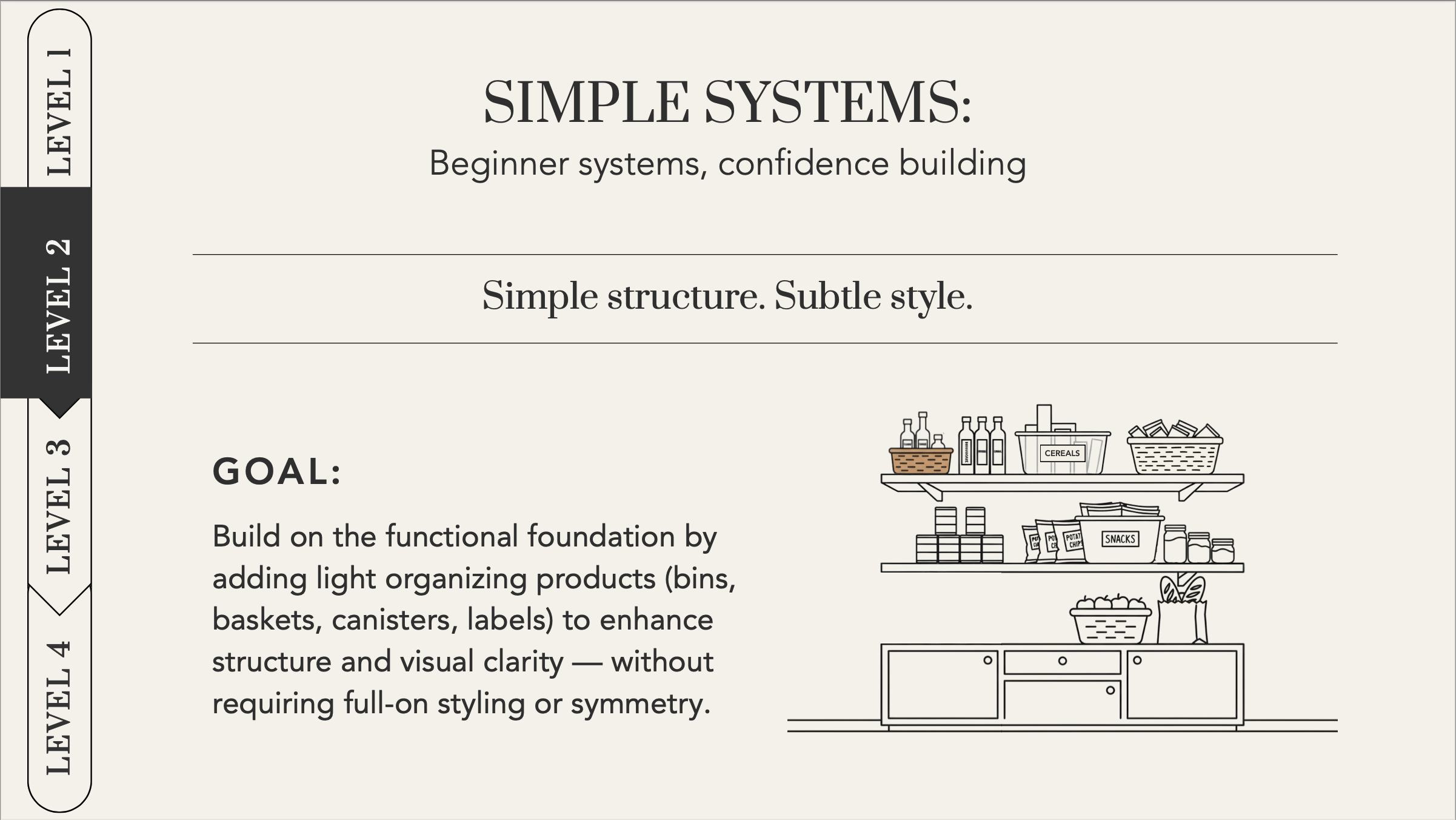 Level 2 builds on your new foundation by adding light organizing products to support daily habits. This level introduces structure and a touch of style while keeping everything approachable and “real life.”