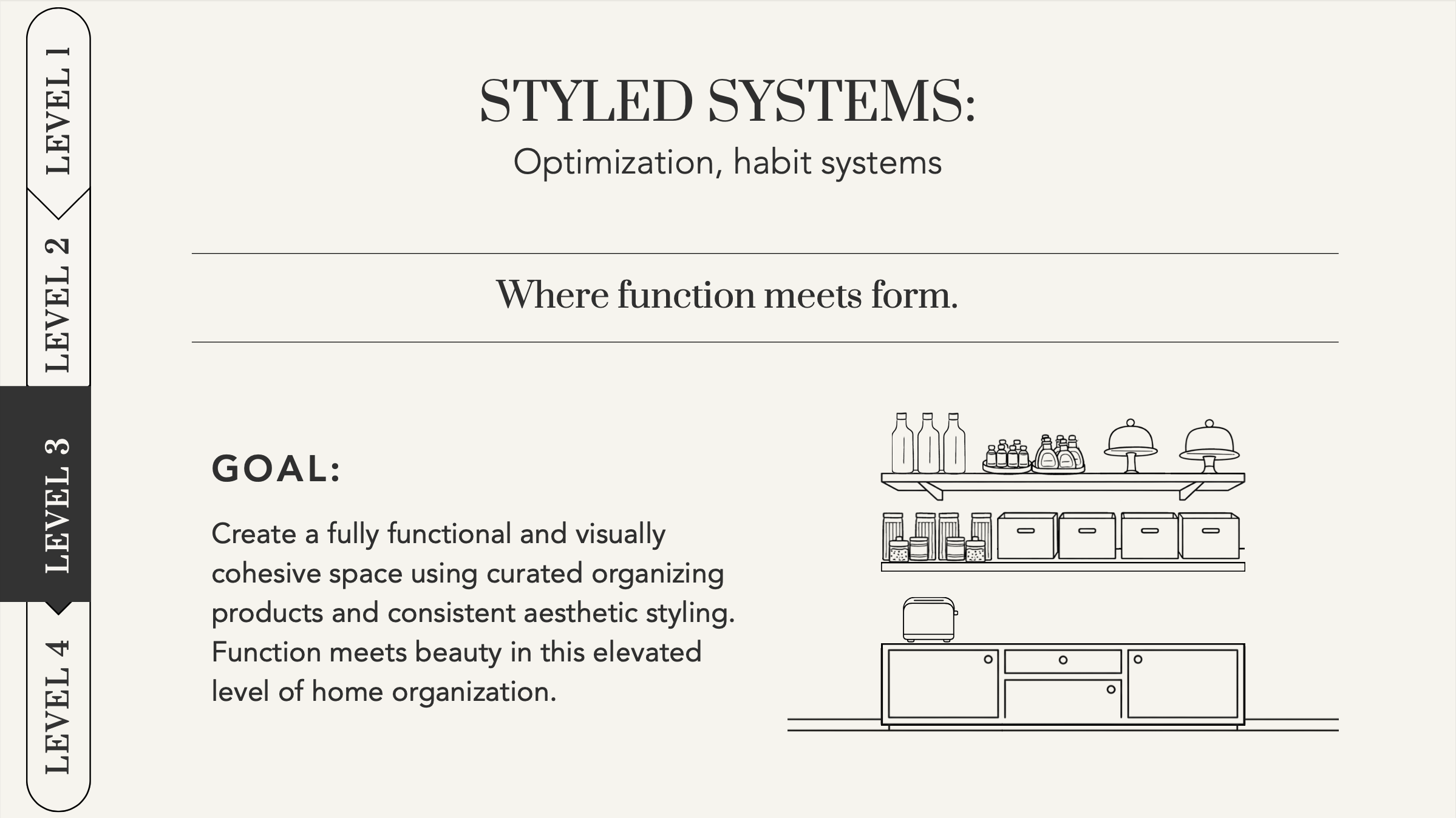 Level 3 is where organization becomes truly elevated. Your systems are fully in place, and now curated products, cohesive materials, and thoughtful styling create a calm, polished look that still works hard for everyday life.